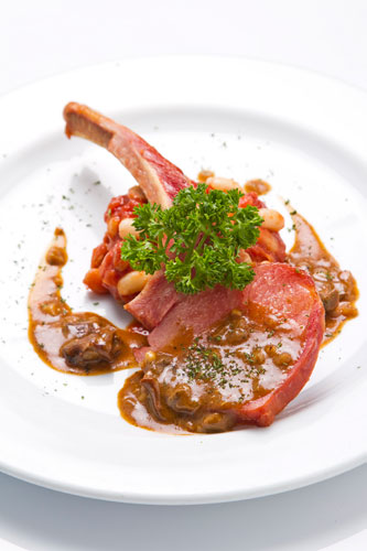 เนื้อหมูรมควันย่างเสิร์ฟกับซอสเห็ดพอร์ชินี่และถั่วขาว