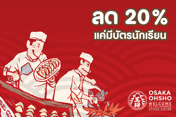 โอซากา โอโช ร้านต้นตำรับเกี๊ยวซ่าชื่อดัง จากญี่ปุ่น ชวนวัยรุ่น และนักเรียน นิสิต/นักศึกษา ร่วมอร่อยกับ เกี๊ยวซ่า สูตรต้นตำรับสไตล์ลับเฉพาะ ของโอซากา โอโช เจ้าของยอดขายกว่า 1.8 ล้านชิ้นต่อวันจากญี่ปุ่น ที่หอมกรุบกรอบนอกนิด ๆ แต่นุ่มในสุด ๆ แบบอัดแน่นด้วยไส้เต็มคำ รสชาติเข้มข้น ชุ่มฉ่ำลิ้น แค่กัดคำแรกก็ฟินกันแบบสุดใจ หรือจะเป็นเมนู "โทเมโทชีสราเม็ง" ที่เชฟบรรจงสร้างสรรค์น้ำซุปสีสันจัดจ้านหอมกรุ่นจากมะเขือเทศสด มาผสมผสานกับเส้นราเม็งหนียวนุ่มพร้อมเนื้อไก่ โรยหน้าด้วย ชีส รสชาติกลมกล่อมละมุนลิ้น ช่วยให้ผิวพรรณแลดูกระจ่างใสขึ้น ได้ทั้งความอร่อยและสุขภาพผิวที่ดี เอาใจหนุ่มๆ สาวๆ เฮลท์ตี้ไม่ควรพลาด หรือจะเลือกอิ่มอร่อยกับเมนูข้าวญี่ปุ่นเหนียวนุ่ม อุ่นๆ ลิ้น ราดหน้าด้วยไข่ฟู หนา นุ่ม อร่อยลิ้น พร้อมซอสข้น หอมกรุ่น อย่าง "ข้าวไข่ฟู หรือฟุวาโทโร เท็นชินฮัง" ให้อร่อยกันแบบสุดคุ้ม เพียงโชว์บัตร นักเรียน นิสิต/นักศึกษา พร้อมรับสิทธิ์พิเศษรับส่วนลดสูงสุด ทันที 20% ! สอบถามรายละเอียดเพิ่มเติมได้ที่ โทร. 02-381-0701 และที่ www.facebook.com/Osakaohshothailand หรือ www.osakaohsho.co.th