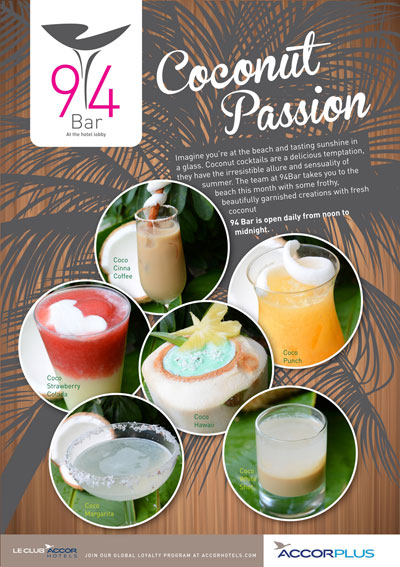 โคโค่มาการิต้า ชื่นใจกับน้ำมะพร้าวสด พร้อมเนื้อมะพร้าวขูดฝอยตกแต่งขอบแก้ว และปิดท้ายสำหรับผู้ที่ชื่นชอบค็อกเทลแบบเข้มข้นกับ โคโค่ไวท์ ช็อต มาสัมผัสกับความพิเศษของเครื่องดื่มหลากหลายชนิดตลอดเดือนกรกฎาคมนี้ ที่ 94 บาร์ ชั้น 1 บริเวณล็อบบี้ โรงแรมโนโวเทล กรุงเทพ อิมแพ็คเปิดบริการทุกวันเวลา 12.00 ? 24.00 น.สอบถามรายละเอียด โทร.02-833-4888 หรือ เว็บไซต์ www.novotelbangkokimpact.com และเฟสบุ๊ค NovotelImpact
