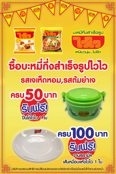 อีกทั้งยังมีโปรโมชั่นพิเศษสำหรับช่วงเทศกาลกินเจ เมื่อซื้อบะหมี่กึ่งสำเร็จรูปไวไวรสเจเห็ดหอม หรือรสเจต้มยำ ครบ 50 บาท รับฟรี ปิ่นโตไวไว จำนวน 1 ใบ /ครบ 100 บาท รับฟรี จานเส้นหมี่อบแห้งไวไว จำนวน 1 ใบ ตลอดช่วงเทศกาล ตั้งแต่ วันที่ 13-21 ตุลาคม 2558
