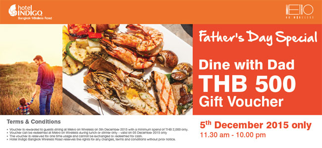 วันพ่อ 5 ธันวาคม 2558 นี้ เพียงพาคุณพ่อมาฉลองที่ห้องอาหาร เมโทร ออนไวร์เลส มื้อกลางวันหรือดินเนอร์ รับทันทีบัตรของขวัญมูลค่า 500 บาท เพื่อใช้เป็นส่วนลดค่าอาหารและเครื่องดื่มได้ทันที โดยสามารถเลือกอิ่มอร่อยได้ทุกเมนู ไม่ว่าจะเป็นรายการอาหารซิกเนเจอร์ บาร์บีคิวดินเนอร์ และเซ็ทอาหารกลางวันและอาหารค่ำ