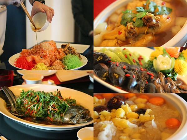สลัดจีน "โหลเหหยี่ซัง"-(Lo Hei Yu Sheng) อาหารเรียกน้ำย่อยจานนี้ ประกอบไปด้วย เนื้อปลาแซลมอนดิบแล่เป็นชิ้นขนาดพอดีคำและสารพัดผักหลากหลายสี ซอสและเครื่องปรุงรสต่างๆ "โหล-เห" (Lo Hei) เมนูอาหารอันเป็นสิริมงคลที่เป็นสัญลักษณ์ของการรวมตัวในครอบครัว และเพื่ออวยพรให้ทุกคนมีอายุยืนนานและร่ำรวยเงินทองไหลมาเทมา และ "หยี่" (Yu) หมายถึง ปลา และ คำว่า "ซัง" (Sheng) หมายถึง ดิบ ซึ่งเป็นปลาแซลมอนดิบเสริฟ์พร้อมส่วนประกอบสารพัดอย่างทั้งหลาย ซึ่งการใช้ปลาแซลมอนมาเป็นส่วน ประกอบนั้น เพราะปลาแซลมอน แสดงถึง ทองคำ เมื่อรับประทานแล้วจะมีความเจริญรุ่งเรือง เป็นศิริมงคล น้ำมันถั่วลิสง หมายถึงการลื่นไหล งาขาวหมายถึงการเจริญงอกงาม ส้มโอ หมายถึง ความโชคดี ไชเท้า หมายถึง การได้เป็นเจ้านายคนหรือมีลาภ