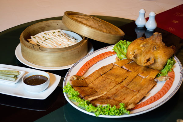 เป็ดปักกิ่ง - จัดเป็นอาหารรสโอชะสไตล์กวางตุ้งที่ทำให้ติ่มซำโด่งดังเป็นอาหารยอดนิยมมาแล้วทั่วโลก มีประวัติความเป็นมากว่า 1500 ปีในตำหรับยาหลวงของหมอหลวงในราชวงศ์หยวนของจีนนั้นก็ได้เขียนถึงวิธีการย่างเป็ด ซึ่งต่อมาก็ได้มีการวิวัฒนาการจนกลายเป็นเป็ดปักกิ่งในปัจจุบัน พร้อมความหมายอันเป็นมงคลในฐานะของไหว้ตรุษจีน ว่าความบริสุทธิ์สะอาด