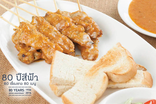 สีฟ้า ชวนจิ้นความอร่อย 1 ใน 80 เมนูยอดนิยมสุดปังที่คงตำนานความอร่อยไม่เปลี่ยนแปลงจนถึงทุกวันนี้ กับเมนูทานเล่นเบาๆ "หมูสะเต๊ะ" ที่สามารถสั่งมารองท้องแชร์กันง่ายๆ ให้ฟินส์กันทุกคำจากความอร่อยนุ่มของหมูสันนอกนำไปหมักให้เนื้อนุ่ม ย่างเตาถ่านด้วยไฟอ่อนๆ จนกลิ่นหอมยั่วน้ำลาย ที่สำคัญเคล็ด(ลับ)ของสีฟ้า ตรงที่เวลาย่างจะพรมด้วยน้ำกะทิ เพื่อให้เนื้อหมูชุ่มฉ่ำหวานหอมมากยิ่งขึ้น เนื้อหมูจะไม่แห้งหรือเกรียมเกินไป ก่อนเสิร์ฟเอาไปคลุกกับน้ำจิ้มหมูสะเต๊ะสูตรสีฟ้า เคียงมาพร้อมขนมปังปิ้งตัดชิ้นเกรียม แบบกำลังหอม กรอบนอกนุ่ม และอาจาดรสเปรี้ยวหวานมาช่วยตัดความมันเลี่ยน พร้อมเสิร์ฟใส่จานด้วยรสชาติที่ลงตัวไม่เหมือนใคร ทำให้ หมูสะเต๊ะ สีฟ้า ติดท็อปเท็นสมคำร่ำลือเป็นเมนูทานเล่นเคียงคู่กับสีฟ้ามายาวนาน 80 ปี