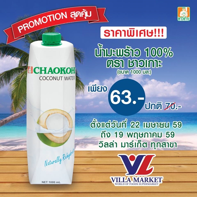 โปรโมชั่น สุดคุ้ม!! น้ำมะพร้าว 100% ตราชาวเกาะ ที่วิลล่า มาร์เก็ต ทุกสาขา