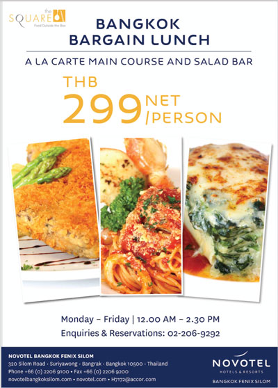 โรงแรมโนโวเทล กรุงเทพ ฟีนิกซ์ สีลม นำเสนอ Bangkok Bargain Lunch มินิบุฟเฟ่ต์มื้อกลางวันสุดคุ้ม ให้คุณเติมพลังระหว่างวันหรือเจรจาธุรกิจระหว่างมื้ออาหารก็เป็นอีกหนึ่งการตัดสินใจที่คุณไม่ต้องหนักใจ เพียงเลือกอร่อยกับอาหารจานหลัก 1 เมนู แล้วรับฟรีบุฟเฟ่ต์สลัดแบบเติมไม่อั้นตลอดสองชั่วโมงครึ่ง