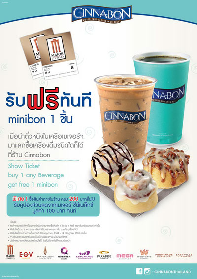 ซินนาบอน (Cinnabon) ภูมิใจเสนอความอร่อยระดับโลกพร้อมเอาใจคนรักภาพยนตร์ ด้วยการจับมือเมเจอร์ ซีนีเพล็กซ์ จัดโปรโมชั่นสุดพิเศษเพียงนำตั๋วหนังในเครือเมเจอร์ ซีนีเพล็กซ์มาแลกซื้อเครื่องดื่มชนิดใดก็ได้ที่ร้านซินนาบอน รับฟรีทันที!! มินิบอน 1 ชิ้น (รสใดก็ได้)