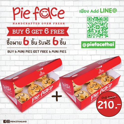 กลับมาอีกครั้งตามตามคำเรียกร้อง! พาย เฟสซ์ (Pie face) พายสูตรลับอารมณ์ดี สไตล์โฮมเมดจากออสเตรเลีย ขนทัพความอร่อยแบบยกกำลังสองมาให้ฟินกันอีกรอบ เมื่อซื้อมินิพายชนิดคาวรสใดก็ได้ 6 ชิ้น รับฟรีมินิพายชนิดคาว อีก 6 ชิ้น! ในราคาเพียง 210 บาทเท่านั้น (จากปกติราคา 420 บาท)