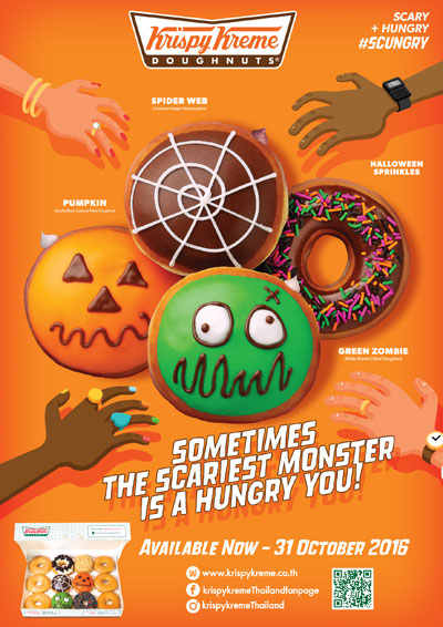 คริสปี้ ครีม ชวนคุณฉลองเทศกาลฮาโลวีน แบบสะพรึงปนน่ารักกับ "คริสปี้ ครีม ฮาโลวีน โดนัท" นำขบวนด้วย พัมพ์กิ้น โดนัท โดนัทเนื้อนุ่มสอดไส้คัสตาร์ดครีมหอมกลิ่นวนิลา ตกแต่งหน้าตาและสีสันให้คงเอกลัษณ์แห่งความเป็น แจ็ก-โอ-แลนเทิร์น (Jack-O-Lantern) ตามด้วย ฮาโลวีน สปริงเคิล โดนัท โดนัทเคลือบหน้าช็อกโกแลตเข้มข้น ที่เติมความสดใสด้วยสปริงเคิลหลากสีสัน สไปเดอร์ เว็บ โดนัท เจ้าใยแมงมุมสีขาว ที่ถูกชักใยด้วยไวท์ ช็อกโกแลต บนโดนัทสอดไส้ช็อกโกแลตฟัดจ์รสนุ่ม และปิดท้ายกับ กรีน ซอมบี้ โดนัท ปีศาจซอมบี้หน้ามึน สอดไส้ครีมเต็ม ๆ คำ ในราคาเพียงชิ้นละ 35 บาท หรือจะอร่อยยกชุดกับ "ฮาโลวีน เซ็ต" ในราคาเพียง 296 บาท (ออริจินัล 6 ชิ้น ฮาโลวีน โดนัท 6 ชิ้น) ตั้งแต่วันที่ 1 ? 31 ตุลาคม 2559 ที่ร้านคริสปี้ ครีม ทุกสาขาใกล้บ้านท่าน