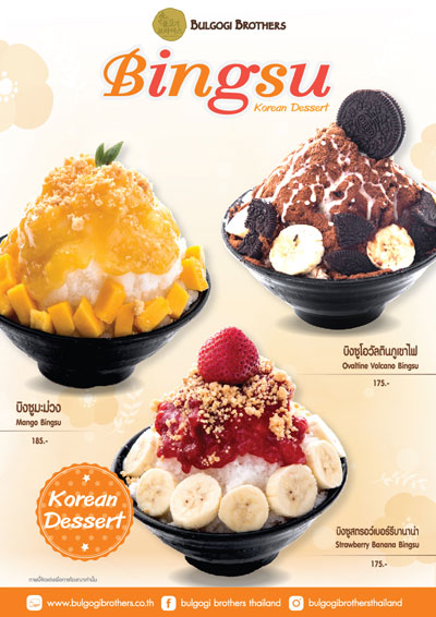 พบกับความเย็นฉ่ำแบบต้นตำรับ "Bingsu Korean Dessert" ตั้งแต่วันนี้ เป็นต้นไป ในราคาเริ่มต้นเพียง 175บาท ที่ร้านอาหารบูลโกกิ บราเธอร์ส ทั้ง 2 สาขา (ชั้น 8 โซนเฮลิกซ์ควอเทียร์ ศูนย์การค้าดิเอ็มควอเทียร์ และ ชั้น 2 โซนซีทเทอรี ศูนย์การค้าสเปลล์ แอท ฟิวเจอร์พาร์ค)