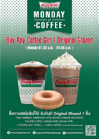 คริสปี้ ครีม ขอนำเสนอโปรโมชั่นใหม่ที่คอกาแฟจะต้องติดใจ กับ "Monday Coffee" เมล็ดกาแฟคั่วเกรดพรีเมี่ยม ที่คั่วจนหอม นำมาบดและกลั่นด้วยความพิถีพิถัน จนได้กาแฟกลิ่นหอมละมุน รสชาติเข้มข้น ที่มีให้เลือกสรรทั้งแบบร้อนและเย็นถึง 8 เมนู ทั้ง เอสเปรสโซ, อเมริกาโน, ลาเต้, มอคค่า, คาราเมล มัคคิอาโต, ไทย ไอซ์ค็อฟฟี่, คาราเมล ลาเต้ และ มอคค่า ลาเต้ และพิเศษสุด ๆ เพียงซื้อกาแฟ 1 แก้ว รับฟรี ! โดนัทคริสปี้ ครีม รสออริจินัล เกรซ โดนัทสูตรลิขสิทธิ์ 1 ชิ้นทันที