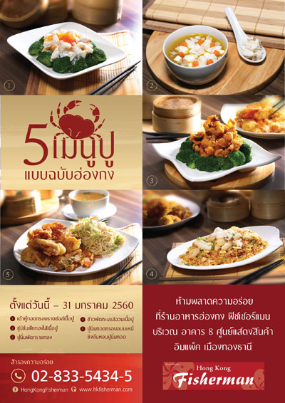 ฮ่องกง ฟิชเชอร์แมน ร้านอาหารจีนสไตล์ฮ่องกงขนานแท้ ชวนคุณสัมผัสบรรยากาศสุดอบอุ่น พร้อมอิ่มอร่อยกับ 5 เมนูปูตำรับภัตตาคารชั้นเลิศ โดยการคิดค้นและปรุงแต่งของเชฟชาวฮ่องกงผู้มากประสบการณ์ เริ่มต้นกับเมนู ปูนิ่มทอดกรอบอบบะหมี่ขิงและต้นหอม ปูนิ่มตัวโตทอดจนเหลืองกรอบทานคู่กับบะหมี่ไข่ชั้นดี ได้ความหอมจากขิงและต้นหอมเข้ากัน ตามด้วยเมนู ปูนิ่มผัดทรายทอง ปูนิ่มคัดพิเศษนำมาผัดกับซอสไข่แดงสูตรเฉพาะเข้มข้นให้ความอร่อยจัดจ้าน ต่อด้วยเมนูเพิ่มความอบอุ่นให้ร่างกาย ซุปข้นฟักทองใส่เนื้อปู กลมกล่อมกับซุปฟักทองเนื้อละมุนเสิร์ฟพร้อมเนื้อปูชิ้นพอคำ อีกหนึ่งเมนูแนะนำ เต้าหู้ทอดกรอบราดซอสเนื้อปู ความกรอบของเต้าหู้ทอดนำมาราดด้วยซอสเนื้อปูให้ความอร่อย ปิดท้ายเอาใจผู้ที่รักการทานข้าวด้วยเมนู ข้าวผัดทะเลเสฉวนเนื้อปู ข้าวหอมมะลิเม็ดสวยผัดกับซอสเสฉวน เติมเครื่องทะเลทั้งกุ้ง เนื้อปลา เนื้อปู และปลาหมึก ให้ความอร่อยในแบบอาหารจีนฮ่องกง ห้ามพลาดกับ 5 เมนูปูชั้นเลิศ ได้ตั้งแต่วันที่ 1 ธันวาคม 2559 - 31 มกราคม 2560 ณ ร้านอาหารฮ่องกง ฟิชเชอร์แมน บริเวณล็อบบี้อาคาร 8 ศูนย์แสดงสินค้า อิมแพ็ค เมืองทองธานี สำรองที่นั่งโทร. 02-833-5434-5 และติดตามข่าวสารโปรโมชั่นเพิ่มเติมผ่านเฟซบุ๊ก HongKongFisherman เว็บไซต์ www.hkfisherman.com