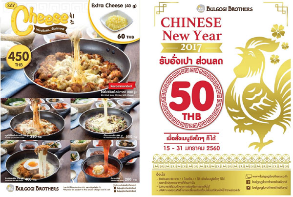 บูลโกกิ บราเธอร์ส (Bulgogi Brothers) ร้านอาหารเกาหลีระดับพรีเมี่ยมชื่อดังจากประเทศเกาหลี พร้อมเสิร์ฟความอร่อยเอาใจสาวกชีสเลิฟเวอร์ ให้ได้ฟินไปกับ "เซย์ ชีส?.เมนูชีสสส สไตล์เกาหลี" ที่จัดเต็มถึง 5 เมนูใหม่รสชาติต้นตำรับเกาหลีแท้ ที่เพิ่มความโดดเด่นด้วยมอสซาเรลล่าชีสเยิ้มๆ เสิร์ฟมาบนกระทะร้อน จนกลายเป็นส่วนผสมความอร่อยของเมนูชีสที่แสนจะลงตัว เริ่มจาก "ไก่สไปซี่ชีสสไตล์เกาหลี" เนื้อน่องไก่แสนนุ่มที่คัดสรรมาอย่างดี ผัดเข้ากับซอสเผ็ดสไตล์เกาหลี เพิ่มสีสันและคุณค่าโภชนาการด้วยหัวหอมใหญ่และแครอทหั่นทรงลูกเต๋า โรยหน้าด้วยชีสเน้นๆ บวกกับออริกาโน ให้รสชาติจัดจ้านสุดกลมกล่อม "เนื้อกวางยางชีส" ชูโรงด้วยเนื้อวัวชั้นดี ผสมผสานเข้ากับซอสสูตรลับเฉพาะจากทางร้าน โรยหน้าด้วยชีสเยิ้มๆ เสิร์ฟคู่กับน้ำจิ้มเกาหลีสูตรเข้มข้น "ข้าวผัดกิมจิชีส" ข้าวผัดกิมจิหมูที่มาพร้อมไข่ดาวสุกกำลังดี รายล้อมไปด้วยชีสร้อนๆ นำมาคลุกเคล้ากันให้รสชาติเข้มข้นถึงใจ นอกจากนี้ยังมี "หมูสไปซี่ชีสสไตล์เกาหลี" และ "ต็อกบกกีชีส" ให้เลือกสรรในราคาเริ่มต้นเพียง 300 บาท และพิเศษสุด ! เฉพาะช่วงเทศกาลตรุษจีนนี้ รับอั่งเปาส่วนลด 50 บาททันที เมื่อสั่งเมนูชีสใดๆ ก็ได้ตั้งแต่วันที่ 15 ? 31 มกราคม 2560