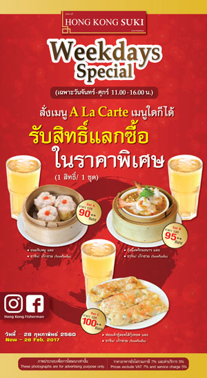 ฮ่องกง สุกี้ จัดโปรโมชั่นวันจันทร์ถึงศุกร์เพียงสั่งเมนูอะลาคาร์ตรับสิทธิ์แลกซื้อชุดติ่มซำราคาพิเศษ