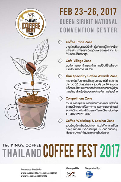 สมาคมกาแฟพิเศษไทย (Specialty Coffee Association of Thailand) หรือ SCATH (สะ-เคท ) เชิญชวนผู้ที่สนใจ ?กาแฟ? ร่วมชม พบปะแลกเปลี่ยน และเรียนรู้เรื่องราวของกาแฟไทย ที่กว่าจะกลายมาเป็นกาแฟแก้วโปรดในมือคุณในงาน Thailand Coffee Fest 2017 เทศกาลกาแฟไทยครั้งที่ 2 ตั้งแต่วันที่ 23-26 กุมภาพันธ์ 2017 เวลา 10.00-20.00 น. ที่ ศูนย์การประชุมแห่งชาติสิริกิติ์ งานเดียวที่รวมคนกาแฟ ตั้งแต่ต้นน้ำบนยอดดอยจนถึงปลายน้ำในเมืองใหญ่ ในงานท่านจะได้พบกับ เกษตรกรผู้ปลูกและโพรเซสกาแฟจากยอดดอย โรงคั่วเมล็ดกาแฟคุณภาพที่จะมานำเสนอเมล็ดกาแฟคั่วในแต่ละโพรไฟล์ ร้านกาแฟอินดี้ชั้นนำของเมืองไทยพร้อมเหล่ากองทัพบาริสต้าแถวหน้าของเมืองไทย และท้ายที่สุดคือบริษัทผู้นำเข้าจัดจำหน่ายอุปกรณ์และผลิตวัตถุดิบที่จำเป็นต้องใช้ในร้านกาแฟทุกชนิด ให้เหล่าเจ้าของร้านกาแฟได้จับจ่ายเลือกซื้อเข้าร้าน รวมถึงให้คำปรึกษาเกี่ยวกับการเปิดร้านกาแฟ สำหรับคนที่อยากทำธุรกิจเกี่ยวกับกาแฟ ไม่ว่าจะอยากเปิดร้านกาแฟ หรือโรงคั่วกาแฟของตัวเอง ทุกอย่างจะครบจบในงานนี้งานเดียวที่ใหญ่ที่สุดในอาเซียน และยังมีกิจกรรมอื่น ๆ ที่น่าสนใจภายในงานมากมาย อาทิ