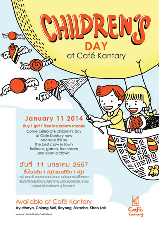 ฉลองวันเด็กที่คาเฟ่ แคนทารี เวลา 15.00 น. - 17.00 น. ที่สาขาอยุธยา เชียงใหม่ ระยอง และเขาหลัก เวลา 11.00 น. ? 13.00 น. เฉพาะที่สาขาศรีราชา วันเด็กปีนี้คาเฟ่ แคนทารี ขอยกขบวนความสนุกด้วยเกมส์สุดท้าทาย พร้อมของรางวัลมากมายมาแจกไม่อั้น เพื่อเฉลิมฉลองให้เด็กๆที่มาร่วมงานได้เพลิดเพลินหรรษาไปกับตัวตลก และลูกโป่งหลากสี