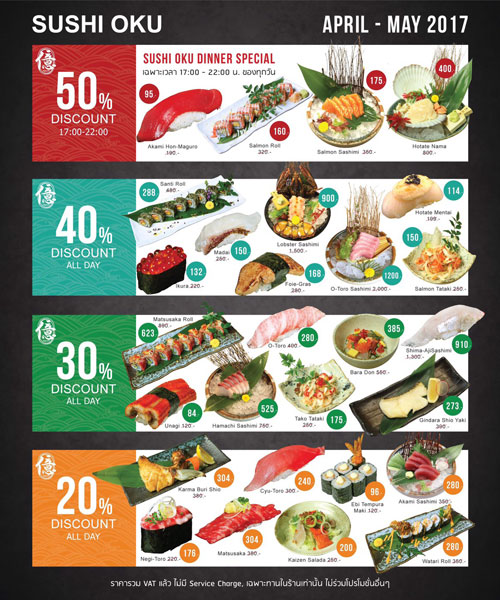 ซูชิโอกุ (Sushi Oku) ร้านซูชิคุณภาพคับแก้ว กลางแหล่งรวมร้านอาหารดังย่าน K-Village ที่คอ ซูชิ ซาซิมิ ไม่ควรพลาด เปิดขบวนซัมเมอร์ พาเหรด ด้วยเมนูยอดนิยมเกือบ 30 เมนู อาทิ Santi Roll โรล signature ของร้าน , Lobster Sashimi ทำจากกุ้งลอบสเตอร์ใหญ่, Tako Tataki ยำปลาหมึกแบบไทย รสชาติไม่ซ้ำใคร และ Watari Roll ปูนิ่มทอดโรล ที่ซูชิโอกุให้ความสำคัญ ตั้งแต่การคัดสรรวัตถุดิบระดับพรีเมี่ยม ปลานำเข้าจากญี่ปุ่น สดใหม่ทุกจานผ่านการปรุงที่พิถีพิถัน จากความใส่ใจอย่างมุ่งมั่นของเชฟชั้นนำที่มีประสบการณ์มานานกว่า 15 ปี เพื่อที่จะให้ได้มาซึ่งรสชาดที่เป็นเลิศ มาเอาใจสาวกพันธ์ปลาดิบกันอย่างจุใจ กับโปรโมชั่นสุดฮอต ด้วยส่วนลดสูงสุดถึง 50 % ให้ลูกค้าได้อร่อยแบบสุดคุ้มกับทุกช่วงเวลา ได้ตั้งแต่วันนี้ ถึง 31 พฤษภาคมนี้