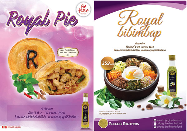 โดยทุกเมนูพระราชทานจะเริ่มจำหน่ายตั้งแต่วันที่ ๒ ? ๓๐ เมษายน ๒๕๖๐ โดย พาย เฟสซ์ ชิ้นละ ๔๙ บาท และบูลโกกิ บราเธอร์ ราคาเพียง ๓๕๙ บาท ทุกเมนูพระราชทานนั้นรายได้หลังหักค่าใช้จ่ายจะนำมอบสมทบทุนมูลนิธิชัยพัฒนา