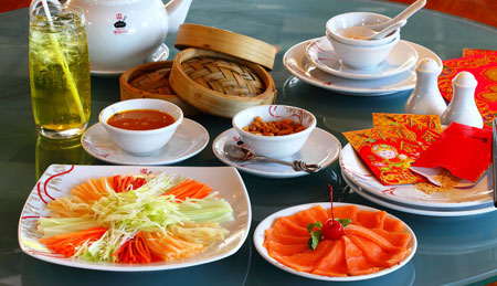 เต็มอิ่มความอร่อยด้วยวัตถุดิบคุณภาพนำเข้าจากประเทศฮ่องกง ขอแนะนำ เมนูปลาดิบสายรุ้ง ปลาแซลมอนสดใหม่ราดซอสน้ำมันงาที่เปรียบเสมือนความเบิกบานมาสู่ชีวิต ขาหมู เฮง เฮง ขาหมูตุ๋นเนื้อนุ่มละลายในปาก เปรียบดั่งชีวิตที่จะมีแต่ความสุขและความเจริญรุ่งเรือง เป็ดอบชาเขียว เป็ดเชอรี่ตัวโต อบจนหอมด้วยชาเขียว กรอบนอกนุ่มใน เสิร์ฟพร้อมซอสสูตรพิเศษ เปรียบเสมือนความสามารถในการทำสิ่งต่างๆ กุ้งแม่น้ำนึ่งกระเทียม กุ้งแม่น้ำคัดพิเศษ นำมานึ่ง โรยหน้าด้วยกระเทียมโทนรสจัดจ้าน ซึ่งกุ้งเปรียบถึงชีวิตที่รุ่งเรือง ปราศจากอุปสรรคใดๆ ปลาหยกนึ่งตั้งฉ่าย ปลาหยกนำเข้าจากประเทศออสเตรเลียเคล้ากับหมูเส้นรสชาติกลมกล่อมเข้าเนื้อ โดยปลาสื่อถึงความอุดมสมบูรณ์ ข้าวห่อใบบัว ข้าวผัดจนหอมเม็ดร่วนผสมเครื่องเทศ เนื้อกุ้ง และไข่ อบจนหอมกรุ่น ปิดท้ายเมนูมงคลด้วยของหวานเพิ่มความสดชื่น บัวลอยน้ำขิงใส้งานอกจากนี้ยังมีติ่มซำมงคลให้เลือกฉลองในเทศกาลพิเศษนี้