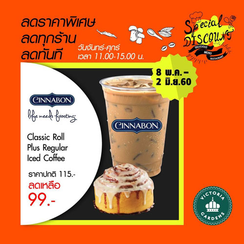 ซินนาบอน (Cinnabon) แบรนด์ขนมอบชื่อดัง ที่ได้รับการขนานนามว่าเป็นแบรนด์ที่มี "ซินนามอนโรล รสชาติดีที่สุดในโลก" ร่วมกับศูนย์การค้า วิคตอเรีย การ์เด้นส์ จัดโปรโมชั่นสุดคุ้ม ! มอบส่วนลดพิเศษแก่ลูกค้าคนสำคัญ ในเมนู "Classic Cinnabon Set" ซินนาบอนรสคลาสสิคหอมกรุ่นซินนามอนและครีมชีส ทานคู่กับเครื่องดื่มกาแฟเย็นรสชาติแสนกลมกล่อม ในราคาเพียงเซ็ตละ 99 บาท จากราคาปกติ 115 บาท เมื่อแสดงคูปอง Special Discount จาก วิคตอเรีย การ์เด้นส์ โดยใช้สิทธิ์ส่วนลดได้ในวันจันทร์ - วันศุกร์ เวลา 11.00 ? 15.00 น. ตั้งแต่วันที่ 8 พฤษภาคม - 2 มิถุนายน 2560 ที่ร้านซินนาบอนสาขาวิคตอเรียการ์เด้นส์