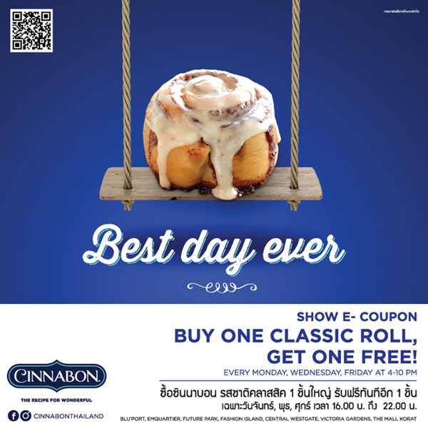 ซินนาบอน (Cinnabon) แบรนด์ขนมอบชื่อดัง ที่ได้รับการขนานนามว่าเป็นแบรนด์ที่มี "ซินนามอนโรล รสชาติดีที่สุดในโลก" มอบสิทธิพิเศษจัดหนักสุดคุ้มกับช่วงเวลาพิเศษดีๆ กว่าใคร ให้ได้อร่อยเพลินๆ กับซินนาบอนคลาสสิคขนาดใหญ่ 1 แถม 1 ทุกวันจันทร์ พุธ ศุกร์ ตั้งแต่เวลา 16:00 น. ? 22:00 น.