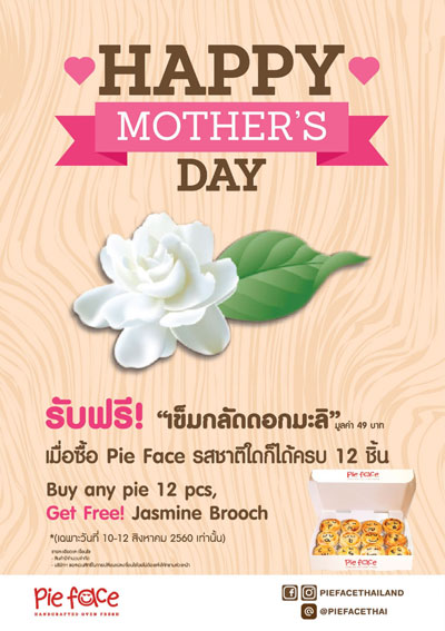 พาย เฟสซ์ (Pie Face) พายสูตรลับอารมณ์ดี สไตล์โฮมเมดจากออสเตรเลีย ชวนคุณตอบแทนความรัก ความห่วงใยแด่คุณแม่ ด้วยเข็มกลัดดอกมะลิแทนใจ กับโปรโมชั่นพิเศษต้อนรับเทศกาลวันแม่ "Happy Mother's Day" เมื่อซื้อพาย เฟสซ์ พายที่คงเอกลักษณ์ของเนื้อพายสี่เลเยอร์เนื้อกรอบนุ่ม ชนิดคาวหรือหวานรสชาติใดก็ได้ จำนวน 12 ชิ้น รับฟรีทันที ! เข็มกลัดดอกมะลิดีไซน์สวยจาก พาย เฟสซ์ จำนวน 1 ชิ้น (มูลค่า 49 บาท)