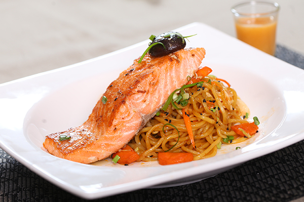 ปลาแซลมอนย่างเสิร์ฟกับซอสออเรนจ์มิโซและผัดยากิโซบะ