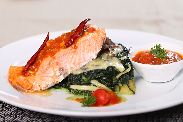 Poached salmon fillet with spicy Arrabiata sauce, Steamed potato, spinach mushroom gratin
