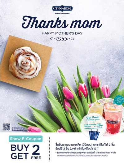 ซินนาบอน (Cinnabon) ให้ทุกครอบครัวได้ร่วมฉลองวันแม่ด้วยขนมแสนอร่อยกับแบรนด์ขนมอบชื่อดัง ที่ได้รับการขนานนามว่าเป็นแบรนด์ที่มี ?ซินนามอนโรล รสชาติดีที่สุดในโลก? ด้วยโปรโมชั่น ซื้อ 2 แถม 2 กับซินนาบอนขนาดเล็ก (มินิบอน) รสชาติใดก็ได้ 2 ชิ้น รับฟรี 2 ชิ้น (มูลค่าเท่ากันหรือต่ำกว่า) เพียงโชว์แบนเนอร์คูปอง Thanks Mom เพื่อรับสิทธิ์ เพียง Add Line : @Cinnabonthai (มี@นำหน้า) ให้ทุกครอบครัวได้สนุกสนานไปกับขนมซินนาบอน ซินนามอลโรลที่หอมกรุ่นไปตลอดวันแม่ในปีนี้