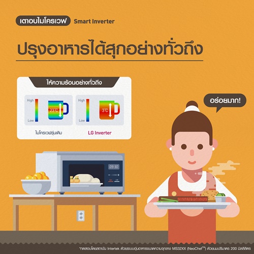 แอลจีนับเป็นแบรนด์แรกๆ ที่พัฒนานวัตกรรมสมาร์ท อินเวอร์เตอร์ ในเตาอบไมโครเวฟให้มีความล้ำสมัยด้วยเทคโนโลยีที่เหนือกว่า เพื่อยกระดับคุณภาพชีวิตของผู้บริโภคทุกกลุ่มให้ก้าวล้ำไปอีกขั้น ตามสโลแกน ?Innovation for a Better Life? หรือนวัตกรรมเพื่อชีวิตที่ดีกว่า เตาอบไมโครเวฟแอลจีด้วยระบบสมาร์ท อินเวอร์เตอร์นี้จึงควบคุมความร้อนได้อย่างแม่นยำ ช่วยรักษาระดับอุณหภูมิทั้งหมดภายในเตาอบไมโครเวฟให้แตกต่างกันไม่เกิน 3 องศาเซลเซียส ถือเป็นการยกระดับการปรุงอาหารด้วยเตาอบไมโครเวฟได้อย่างที่อย่างมีนัยสำคัญเมื่อเปรียบเทียบกับไมโครเวฟรุ่นอื่น ๆ ที่ไม่ใช้ระบบอินเวอร์เตอร์ ช่วยให้อาหารถูกปรุงสุกด้วยความร้อนที่ทั่วถึงและละลายอาหารแช่แข็งได้รวดเร็วยิ่งขึ้น