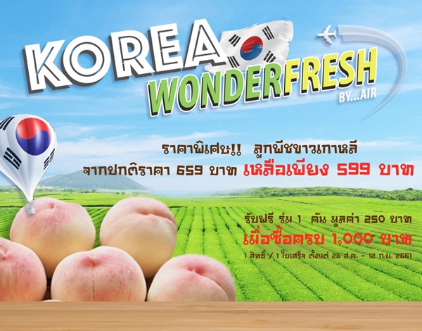 งาน Korea Wonder Fresh จัดโปรโมชั่นรับพายุฝน เอาใจสาวกผลไม้เกาหลี เพียงซื้อ ลูกพีชขาวเกาหลี 1 แพ็ค ในราคาปกติราคา 659 บาท ลดราคาสุดพิเศษเหลือเพียงแพ็คละ 599 บาท แถมเพิ่มทันทีเมื่อซื้อครบ 1,000 บาท รับร่ม 1 คัน มูลค่า 250 บาท (1 สิทธิ์ / 1 ใบเสร็จ) ตั้งแต่วันนี้ ? 12 กันยายน 2561 ณ งาน Korea Wonder Fresh ทั้ง 4 สาขา ได้แก่ กูร์เมต์ มาร์เก็ต ชั้น G สาขาพารากอนดีพาร์ทเม้นต์สโตร์, กูร์เมต์ มาร์เก็ต ชั้น 4 สาขาเอ็มโพเรียม, กูร์เมต์ มาร์เก็ต ชั้น G สาขาเอ็มควอเทียร์ และสาขาใหม่ล่าสุด กูร์เมต์ มาร์เก็ต ชั้น G เดอะมอลล์บางแค ติดตามข่าวโปรโมชั่นอื่นๆ ที่ www.facebook.com/vachamonfood