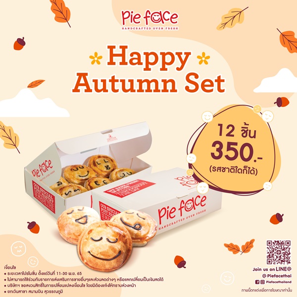 พาย เฟสซ์ (Pie Face) พายสูตรลับอารมณ์ดี ชวนทุกคนให้มายิ้มรับความสดใส เปลี่ยนทุกบรรยากาศให้จอยไปกับความน่ารักของพาย กรอบนอก นุ่มใน ที่คงเอกลักษณ์ของเนื้อพายสี่เลเยอร์ สไตล์โฮมเมดจากออสเตรเลีย กับโปรโมชั่นสุดคุ้มส่งท้ายปี Happy Autumn set คละรสชาติได้ทั้งพายรสชาติคาว-หวาน จัดเต็มถึง 12 ชิ้น ในราคาเพียง 350 บาท เท่านั้น
