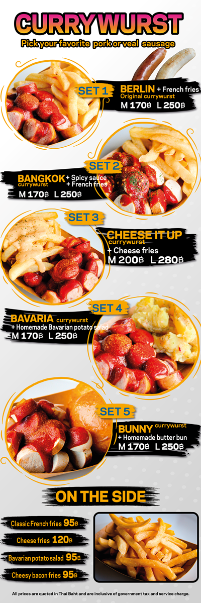 พร้อมเสิร์ฟความอร่อยแล้วที่ใจกลางสุขุมวิทซอย 11 ของกรุงเทพ ลูกค้าสามารถเพลิดเพลินกับไส้กรอกหมูหรือเนื้อลูกวัวที่ชื่นชอบพร้อมซอสรสเลิศและเครื่องเคียงหลากหลายในราคาเริ่มต้นที่ 170 บาทสุทธิต่อชุด อาทิ ชุดที่ 1: ชุดเบอร์ลิน (เคอร์รี่เวิร์สต์ต้นตำรับและเฟรนช์ฟรายส์) ชุดที่ 2: ชุดกรุงเทพ (เคอร์รี่เวิร์สต์ราดซอสเผ็ดไทยและเฟรนช์ฟรายส์) ชุดที่ 3: ชุดชีสอิทอัพ (เคอร์รี่เวิร์สต์และชีสฟรายส์) ชุดที่ 4: ชุดบาวาเรีย (เคอร์รี่เวิร์สต์และสลัดมันฝรั่งสไตล์บาวาเรียน) ชุดที่ 5: ชุดบันนี (เคอร์รี่เวิร์สต์และขนมปังบัน) นอกจากนี้ยังมีเครื่องเคียงหลากหลายอาทิ คลาสสิกเฟรนช์ฟรายส์ ชีสฟรายส์ สลัดมันฝรั่งสไตล์บาวาเรียน และเบคอนชีสฟรายส์