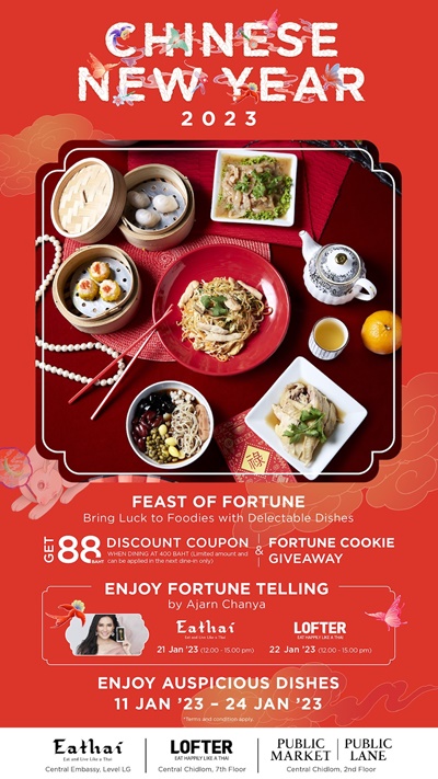 ไม่เพียงแค่เมนูเด็ดที่นำมาแนะนำเหล่า Food Lover ให้ได้ลิ้มรสความอร่อย ช่วงตรุษจีนนี้ ห้างเซ็นทรัลยังจัดกิจกรรมพิเศษให้ลูกค้า ได้เช็คดวงฟรี! กับหมอดูชื่อดัง อาจารย์ ชัญญ่า ราชินีไพ่จิตสัมผัส เมื่อรับประทานอาหารครบ 400 บาทที่ Eathai ชั้น LG ศูนย์การค้าเซ็นทรัล เอ็มบาสซี วันที่ 21 ม.ค. 66 เวลา 12:00 ? 16:00 น. และ LOFTER @ Central Chidlom ชั้น 7 ห้างเซ็นทรัลชิดลม วันที่ 22 ม.ค. 66 เวลา 12:00 ? 16:00 น. อีกด้วย