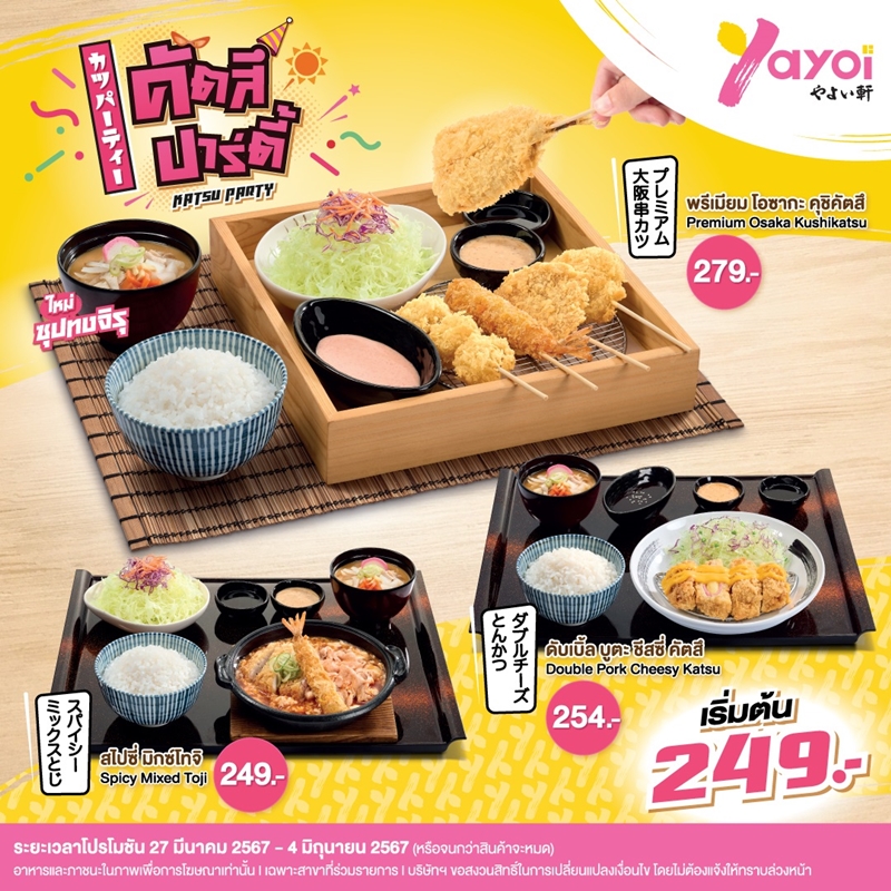 หน้าร้อนนี้ ยาโยอิ ราชาเทโชกุตัวจริง ที่เปิดให้บริการมายาวนานกว่า 138 ปีในประเทศญี่ปุ่น และ 18 ปีในประเทศไทย จัดโปรฯ เด็ดเอาใจแฟนอาหารญี่ปุ่น มาพร้อม 3 โปรฯ ใหม่ ตอบโจทย์ทุกความชอบที่หลากหลาย สำหรับรับประทานที่ร้าน ซื้อกลับบ้าน และบริการยาโยอิเดลิเวอรี กับเซตคัตสึ ปาร์ตี้ (Katsu Party) สไปซี่ สลัด (Spicy Salad) และคูลลิ่ง ซัมเมอร์ (Cooling Summer) เลือกอร่อยได้ตามใจ ห้ามพลาด!ตั้งแต่วันนี้ถึง 4 มิถุนายน 2567