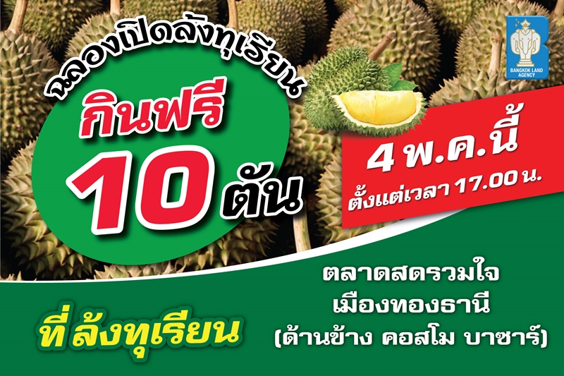 บางกอกแลนด์ เตรียมเปิดศูนย์จำหน่ายทุเรียนส่ง-ปลีก @ ตลาดสดรวมใจ เมืองทองธานี จัดใหญ่ แจกทุเรียนฟรี 10 ตัน เฉพาะวันที่ 4 พ.ค.นี้ ตั้งแต่เวลา17.00 น.เป็นต้นไป