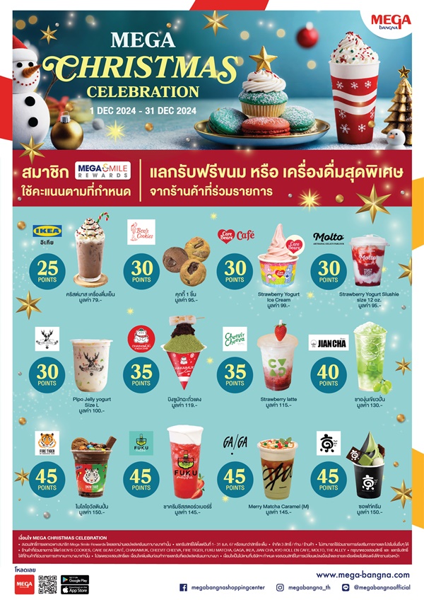 ศูนย์การค้าเมกาบางนา ร่วมเติมเต็มความสุขให้ทุกคนในช่วงเทศกาลคริสต์มาสและปีใหม่ ในแคมเปญ MEGA CHRISTMAS CELEBRATION ด้วยสิทธิพิเศษสำหรับสมาชิก เมกา สไมล์ รีวอร์ดส แลกรับฟรีเมนูขนมและเครื่องดื่มสุดพิเศษจาก 12 ร้านชื่อดัง เพียงใช้คะแนนตามเงื่อนไขกับร้านที่ร่วมรายการ เฉพาะที่เมกาบางนาเท่านั้น!