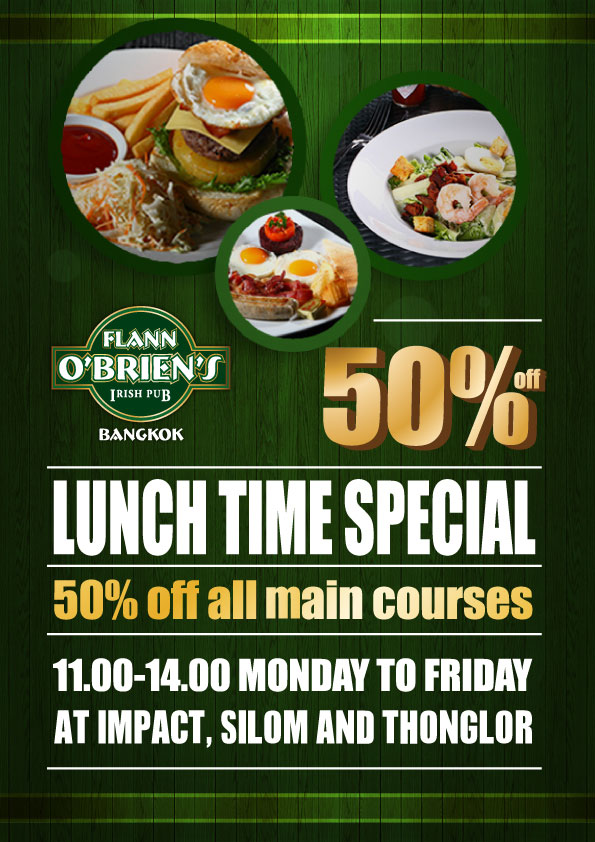 ฟลานโอเบรียนส์ ไอริชผับ ร้านอาหารและผับสไตล์ไอริชขนานแท้ในบรรยากาศที่เป็นกันเอง ภายใต้การบริหารงานของอิมแพ็ค ขอแนะนำโปรโมชั่นมื้อกลางวันสุดคุ้มเอาใจคนรักอาหารไอริชเพียงครึ่งราคา ตั้งแต่วันจันทร์- ศุกร์ ระหว่างเวลา 11.00 - 14.00 น. ลูกค้าสามารถอิ่มอร่อยกับหลากหลายเมนูสไตล์ไอริชกว่า 60 รายการ เช่น บีฟแอนด์กินเนสพาย ฟลานบิ๊กเบรคฟาสต์สตูว์แกะ ฟิชแอนด์ชิพส์ สลัด เบอร์เกอร์ชนิดต่างๆ และอีกมากมาย พร้อมทั้งเครื่องดื่มที่ร้านฟลานโอเบรียนส์ ไอริชผับทั้ง 3 สาขา ไม่ว่าจะเป็นสาขาอิมแพ็ค บริเวณฟู้ดเอเทรียมชั้น 1 อาคารชาเลนเจอร์ 3 อิมแพ็ค เมืองทองธานี สาขาสีลม (ธนิยะ) และสาขาทองหล่อ (ตึกเอ้ท)