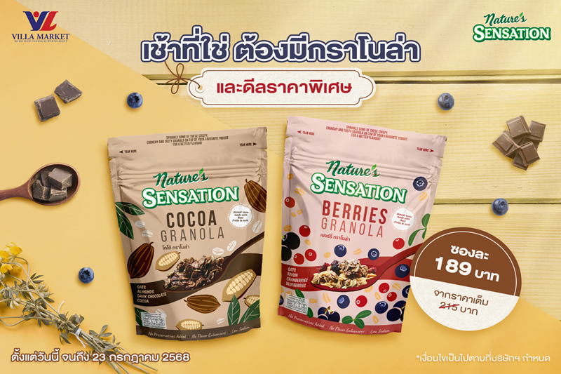 เนเจอร์ เซ็นเซชั่น ผลิตภัณฑ์ธัญพืช ผลไม้อบแห้ง และน้ำผลไม้ออร์แกนิค ภายใต้การดูแลของเครือเฮอริเทจ ต้อนรับวันใหม่ของทุกท่านอย่างสดใสด้วยกราโนล่าพรีเมียมราคาโดนใจ ซื้อเนเจอร์ เซ็นเซชั่น เบอร์รี่ กราโนล่า (ขนาด 454 กรัม) และเนเจอร์ เซ็นเซชั่น โกโก้ กราโนล่า (ขนาด 454 กรัม) เพียงซองละ 189 บาท จากราคาปกติ 215 บาท นอนหลับเต็มอิ่มแล้วตื่นมาเติมพลังกับกราโนล่าจานโปรดของคุณ เริ่มต้นวันดี ๆ ไปด้วยกันกับเนเจอร์ เซ็นเซชั่น ตั้งแต่วันนี้ ถึง 23 กรกฎาคม 2568 เท่านั้น ที่วิลล่า มาร์เก็ท ทุกสาขา สามารถสอบถามข้อมูลเพิ่มเติมหรือติดตามข่าวสารและกิจกรรมต่างๆได้ที่ https://www.facebook.com/naturessensationth และ IG: naturessensation