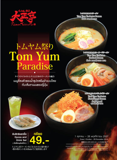 ไทโช-เต ราเมน ร้านราเมนสไตล์ญี่ปุ่นที่อิมแพ็ค ชวนคุณมาอร่อยกับราเมนชามโต เส้นเหนียวนุ่ม น้ำซุปเข้มข้นแบบญี่ปุ่นขนานแท้ และขอเอาใจคนรักความจัดจ้าน รสชาติ เด็ดเผ็ดร้อน ของน้ำซุปต้มยำ หอมเครื่องสมุนไพรรสชาติแบบไทยๆ ด้วยขบวน "ต้มยำพาราไดซ์" ที่ผสานความลงตัวของเส้นราเมนญี่ปุ่นกับน้ำซุปต้มยำแบบไทยพร้อมมอบสิทธิพิเศษ เมื่อลูกค้าเลือกสรรความอร่อยกับ 3 เมนูราเมนน้ำซุปต้มยำ เมนูใดก็ได้ ไม่ว่าจะเป็น เมนูต้มยำทงคตสึ ราเมน เมนูต้มยำทงคตสึ ราเมน ทะเล ที่เสิร์ฟครบเครื่องทะเล ทั้งกุ้ง ปูอัด พร้อมไข่ยางมะตูม หรือเมนูต้มยำทงคตสึ คาราชิเนกิ ราเมน สามารถแลกซื้อเกี๊ยวซ่า และเครื่องดื่มได้ในราคาพิเศษเพียง 49 บาทเท่านั้น สามารถลิ้มลองรสชาติความอร่อยแบบเผ็ดร้อนไม่เหมือนใคร ได้ตั้งแต่วันนี้ ? 28 พฤศจิกายน 2557 ที่ร้านไทโช-เต ราเมน บริเวณฟู้ดเอเทรียมชั้น 1 อาคารชาเลนเจอร์ 3 ศูนย์แสดงสินค้าและการประชุมอิมแพ็ค เมืองทองธานี สอบถามข้อมูลเพิ่มเติมหรือสำรองที่นั่ง โทร. 02-833-4284หรือที่ www.facebook.com/TSUBOHACHITH